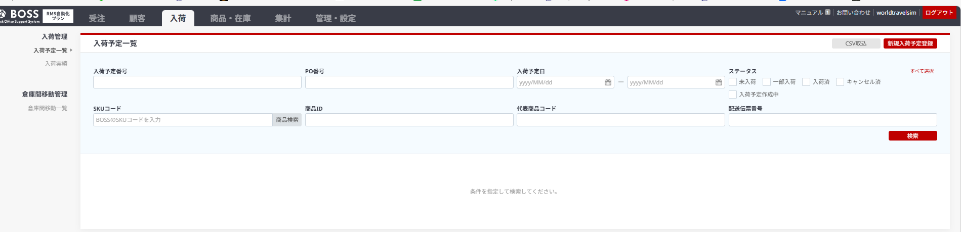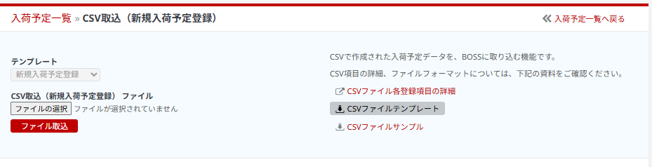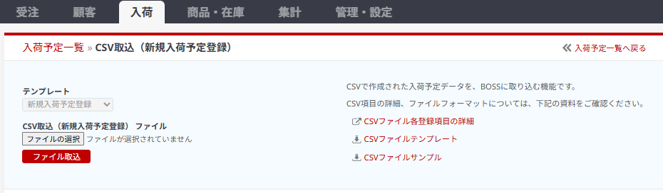 ⑥ファイルをPCに保存したら、BOSSに戻り、入荷→CSV取込→ファイル取込からアップロード