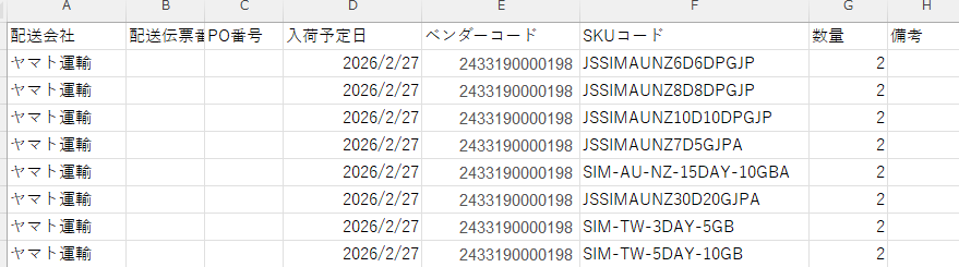⑤配送会社 入荷予定日 ベンダーコード SKUコード 数量 を記載