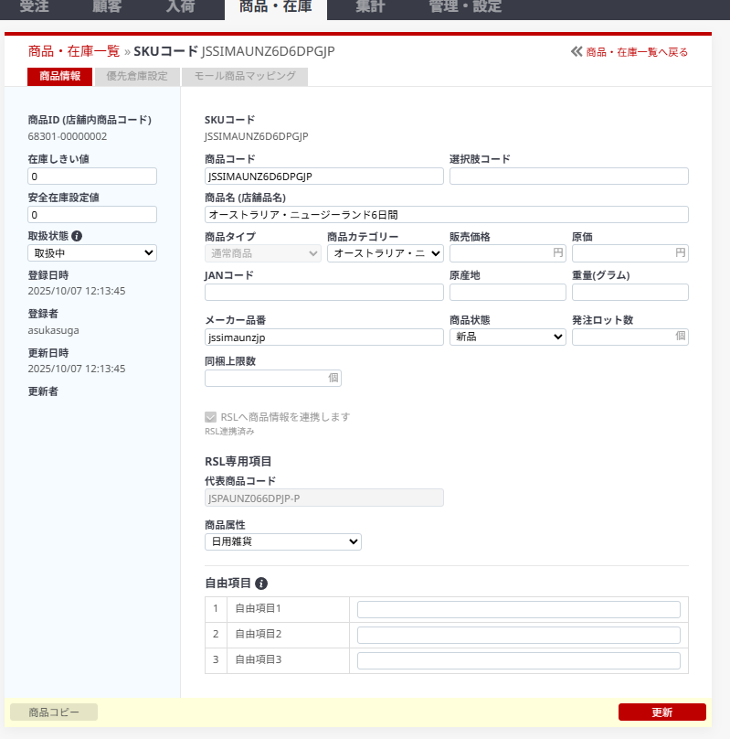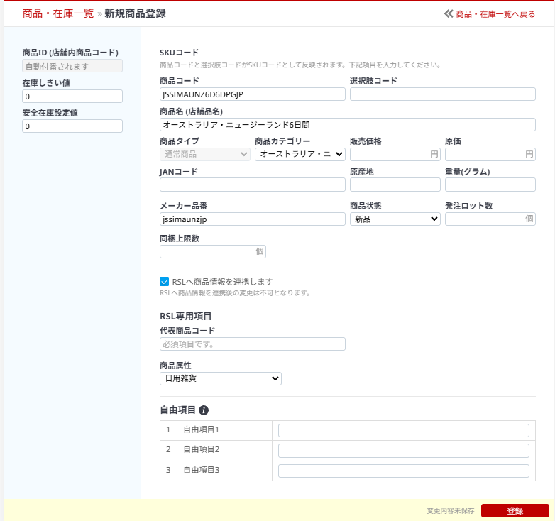 ③商品コードに楽天のSKUを入力、商品名を入力、メーカー品番は楽天の管理番号(親SKU)を入力、「RSLへ商品情報を連携します」にチェックを入れて、代表商品コードはProduct listのWIX codeを入力