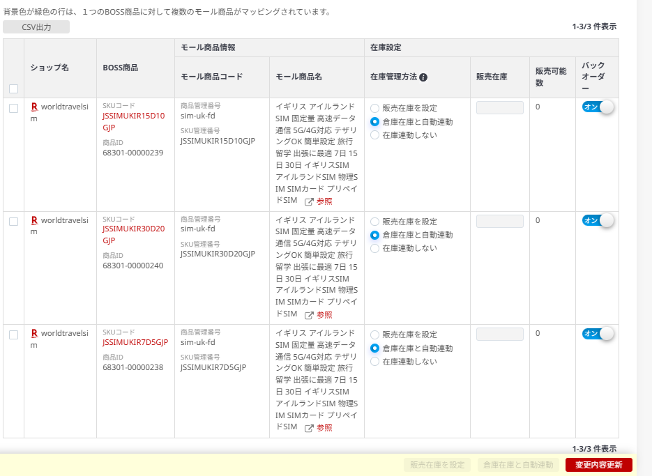 ⑧赤文字「在庫設定」を選択し、「倉庫在庫と自動連携」を選択し、右下の変更内容更新を選択